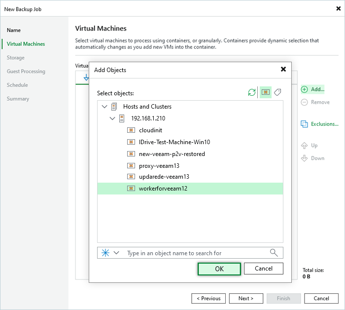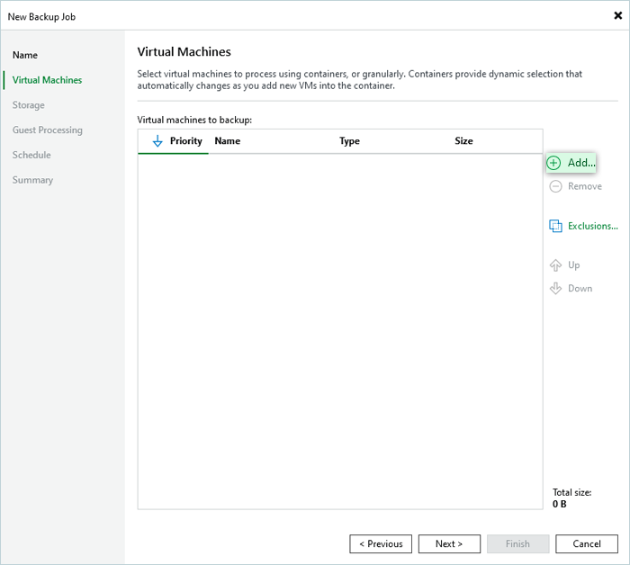 4. Click the Add in Virtual Machines tab to select the Proxmox virtual machine for backup.