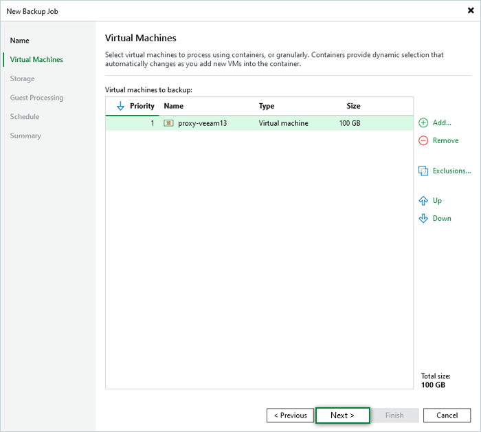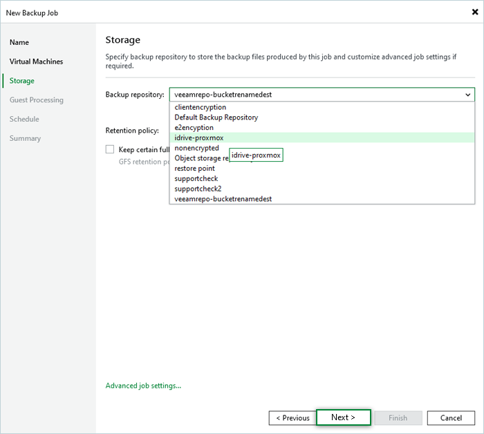 5. In the Storage tab, click the Backup Repository list, select the repository added in the previous step, and click Next.