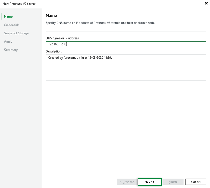 5. In the New Proxmox VE Server window, enter the DNS Name or IP Address of the server. Click Next.